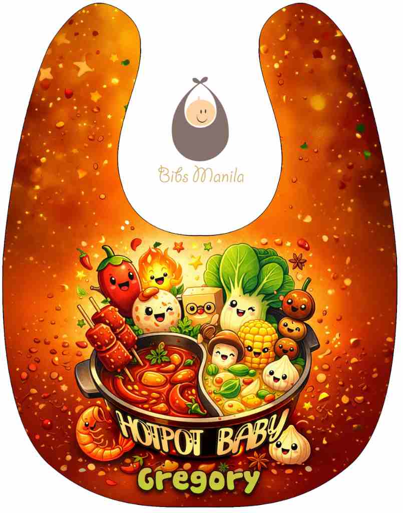 The Hotpot Baby Bib features a playful hotpot filled with adorable ingredients—from smiling dumplings and corn to cheerful veggies and spicy peppers. Inspired by the famous hotpot culture of Chongqing, this design turns mealtime into a fun and colorful feast.